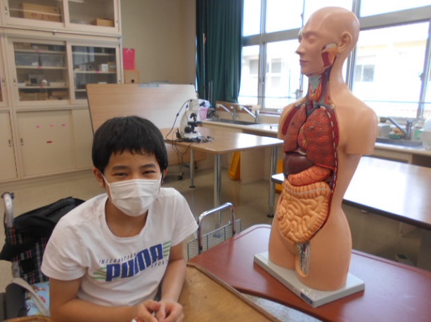 2年生は、人体模型を使って、制限時間内に臓器の位置を正しく