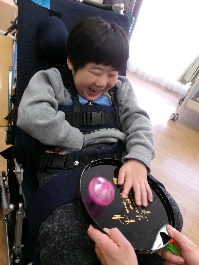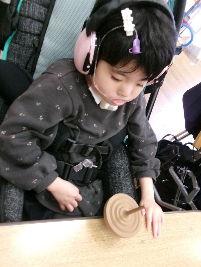 いろいろな種類のコマを回しました。うまく回せたときは、「やったあ!」と笑顔がこぼれます。コマが回る様子を見たり、振動を感じたりして興味津々。真剣なまなざしで見つめながら、触ってみたい気持ちを抑えきれず手を伸ばしてしまうことも。バランスを崩してコマが倒れたり、机から落ちたりするのが面白くて声を出して笑ってしまいました。あっという間の楽しい1時間でした。