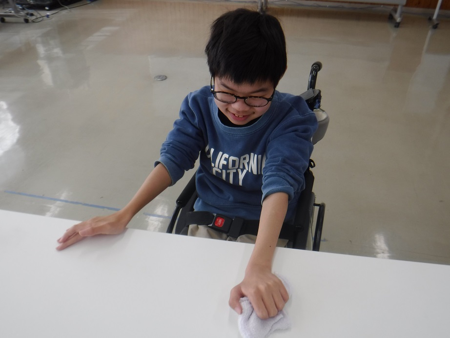 もうすぐ年末…大掃除の季節がやってきました。Cグループの3人はおそうじ隊として、掃除場所のリクエストを募り、校内の掃除をがんばっています。この日は、会議室の長机をきれいにしてほしいという要望を受けて、みんなで拭き掃除をがんばりました。みんなで協力して、全部で12枚の机をきれいにすることができました。また来週も校内の掃除に出掛けたいと思います。