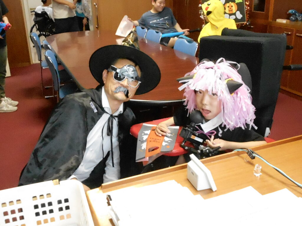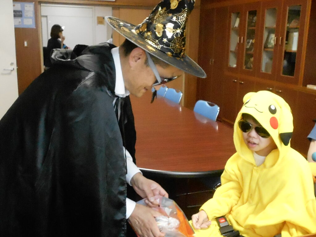 思い思いに仮装して、校長室や事務室や食堂を訪問し「トリックオアトリート」の合言葉を言って、お菓子をもらいました。たくさんの職員に見ていただきたくて職員室に行くと、拍手で迎えられ「かわいい!」など声を掛けられて嬉しそうでした。(^^♪(^^♪