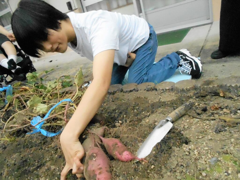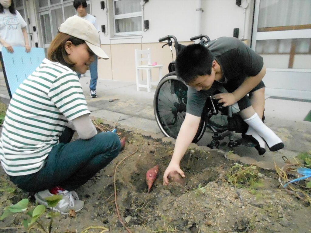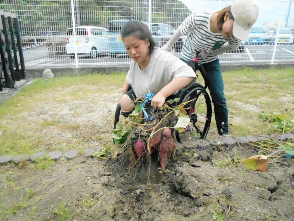 「うぅん」と力を込めて。「よいしょ」の掛け声と共に職員と力を合わせて、芋を引っ張りました。ふっくらした大きな芋、おいしそうな芋が土の中からでてきました。みんな達成感でいっぱいです。次は、この芋を使ってスイートポテト作りをします。楽しみです(^^♪(^^♪