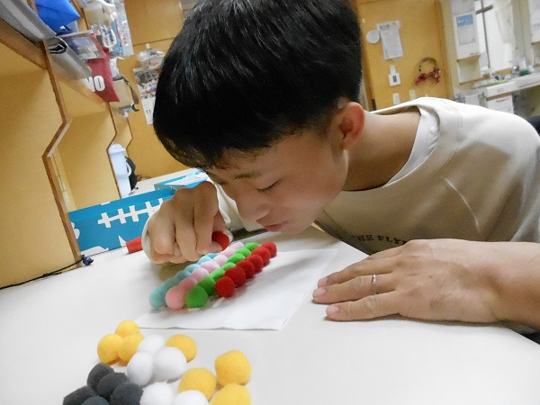 3つ目は、デコレーションボールを使ってコースター作りをしました。デコレーションボールの色を自由に並べたり、規則性をもって並べたりと、カラフルなコースターが作れました。