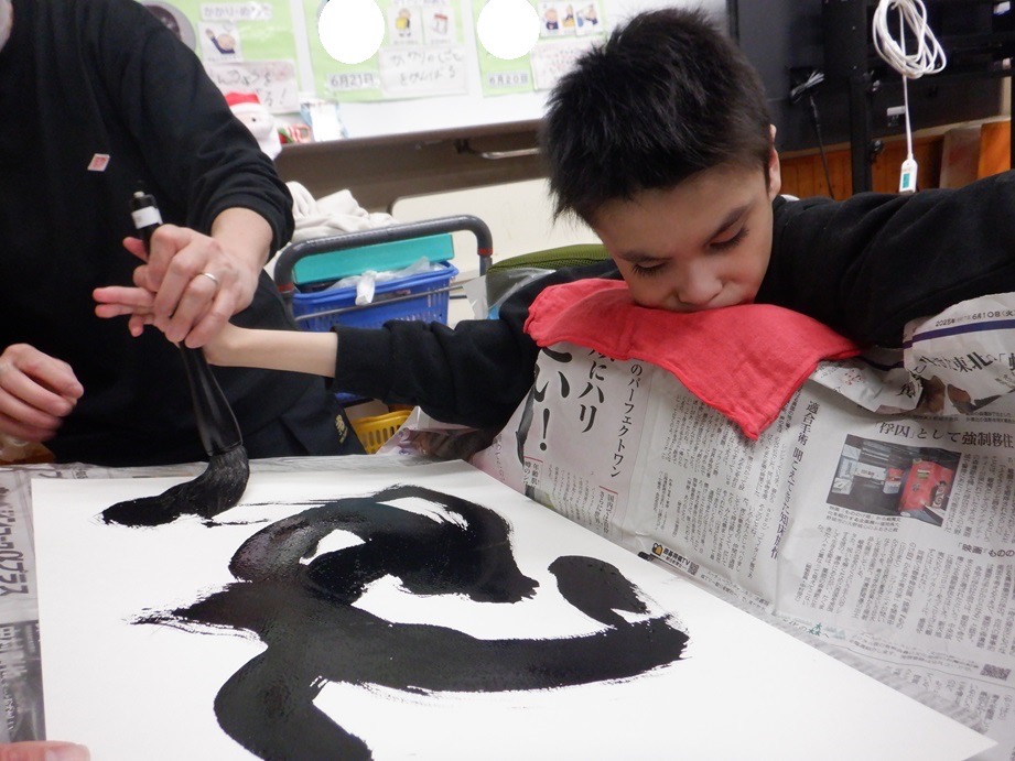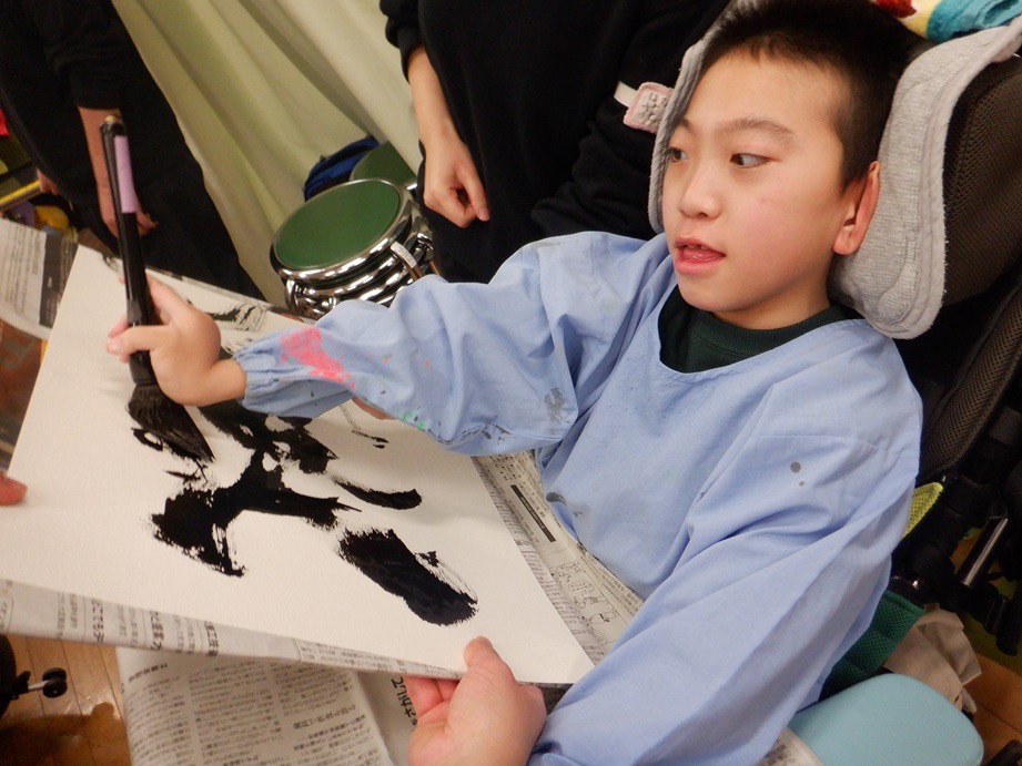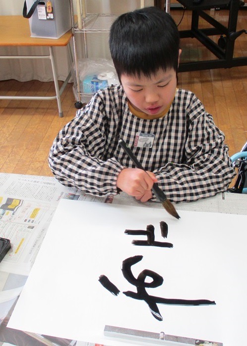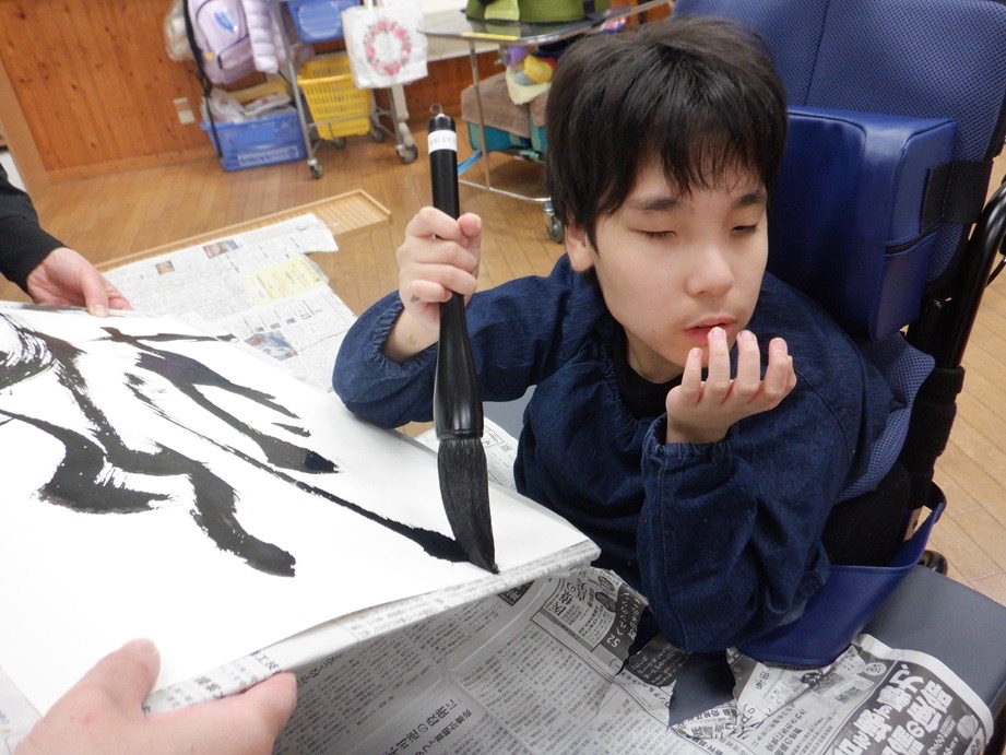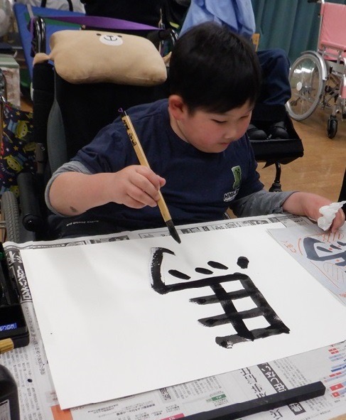 手や腕をのびのびと動かしながら書いたり、自分が好きな言葉や今年の干支を書いたりと、筆を使って思い思いに書くのを楽しんでいました。