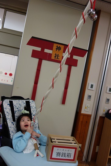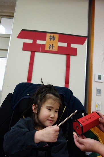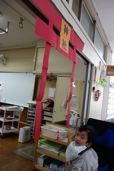 3学期初めての学活で、お正月体験をしました。まず、教室内に作った1年生神社に初詣に行きました。
