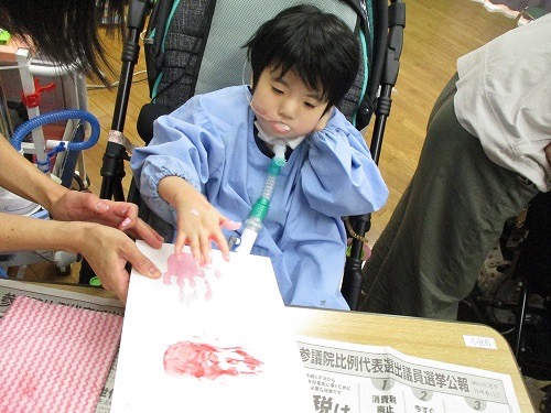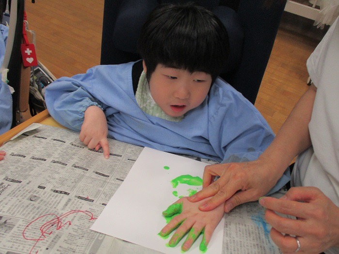 文化祭の看板に飾る手形を取りました。ちょっぴり冷たい絵の具の感触を楽しみながら、それぞれの手形が取れました。