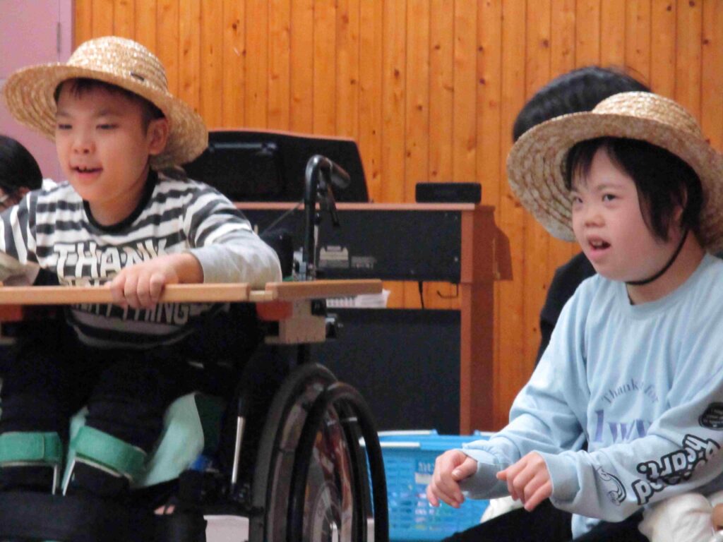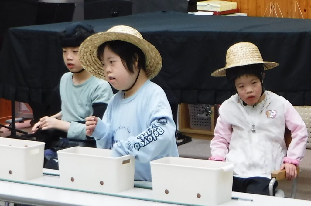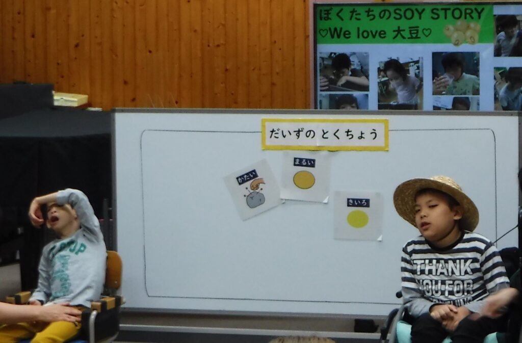 生活の授業で育てた大豆の成長過程を取り上げ、国語、算数、歌・合奏、ダンスの学習発表をしました。
