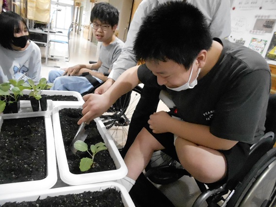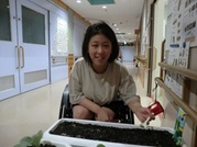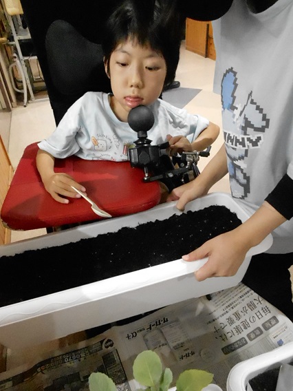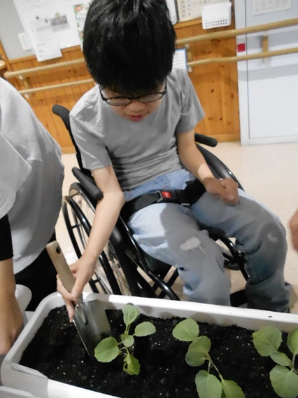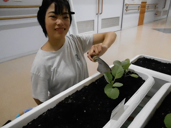 畑の土づくりの間にプランター栽培を始めました。ホウレンソウとネギの種をまきました。ミニキャベツの苗も植えました。