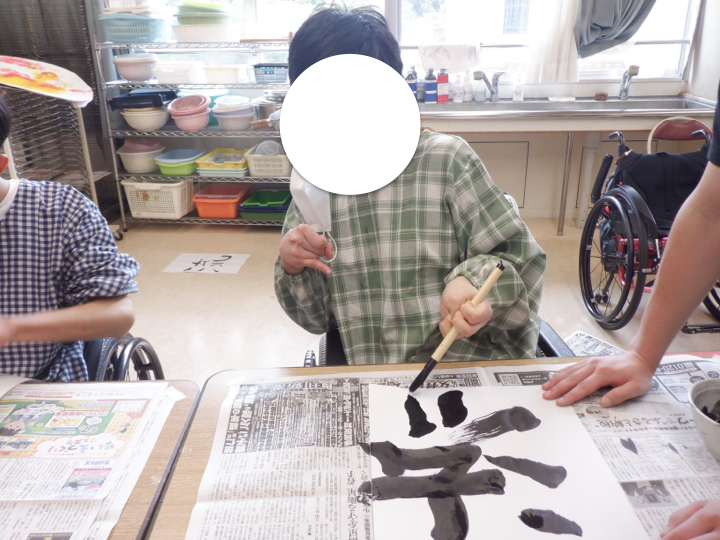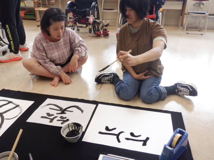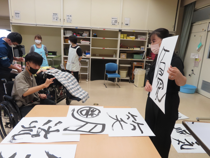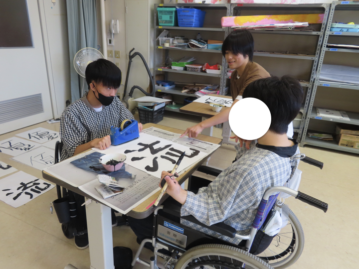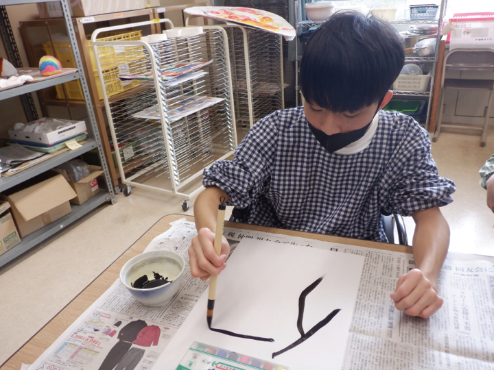 「2学期は書道がしたい!」という生徒の希望多数。文化祭展示に出品することを目標に、どのような作品にするかをみんなで話し合いました。その結果、「自分を漢字一文字で表すと・・・」というテーマで作品を作ることになりました。