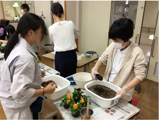 今回の活動は,花の寄せ植えです。自分たちの作りたいイメージを瀬戸南高等学校の生徒に伝え,設計図を見ながら作製しました。瀬戸南高等学校の生徒が,丁寧に作業工程を説明してくれたり,アドバイスしてくれたりして,イメージ通りの花の寄せ植えを完成させることができました。
