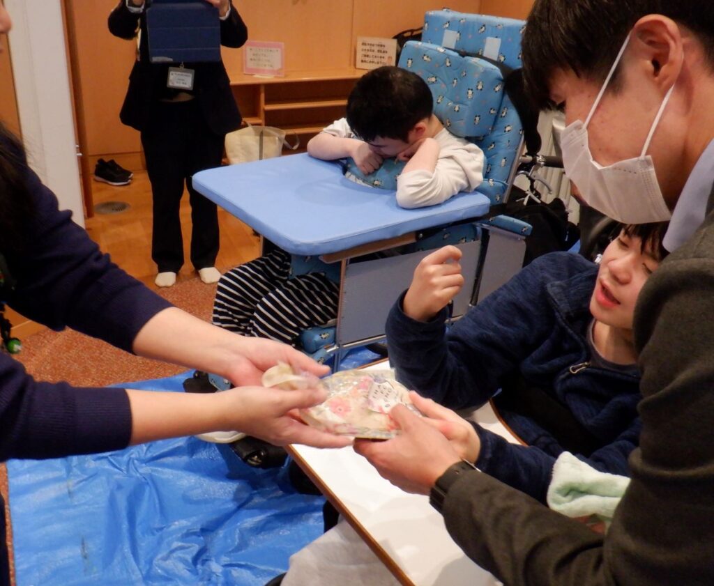 職業、家庭の時間に作った、小豆染めのしおりをA、Bそれぞれのグループ代表者から、感謝の気持ちを込めて手渡しし、県立図書館を後にしました。
