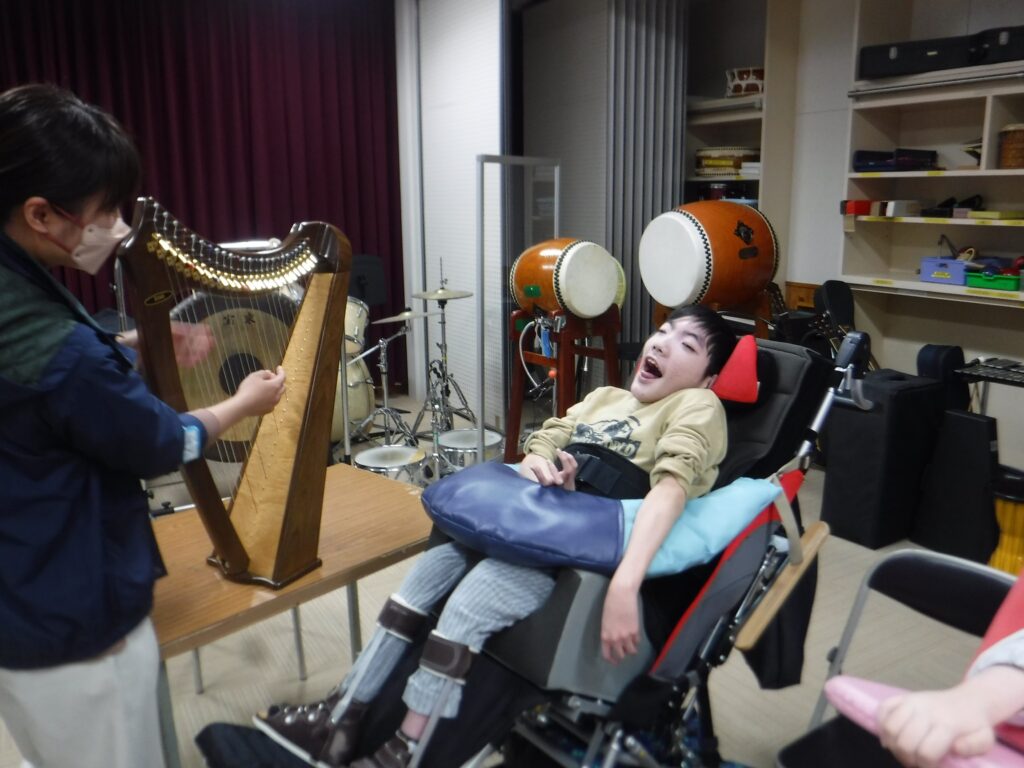 ハープの音を聴くと表情を変え、笑顔で好きな音色の演奏を楽しみました。