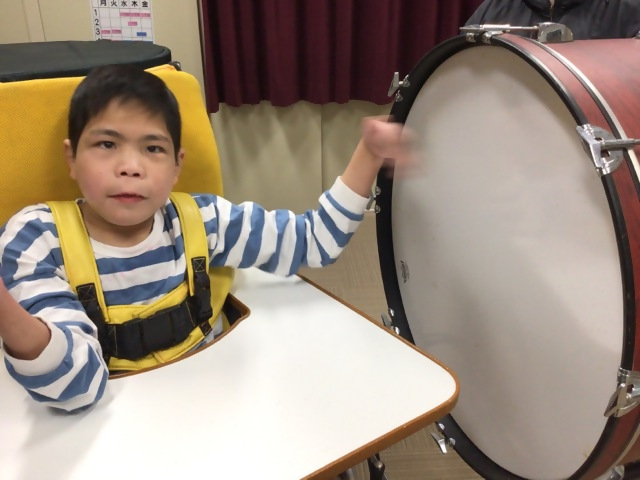 【太鼓】 直接手でたたいたり、ばちを持って鳴らしたりして、音や振動を楽しみました。