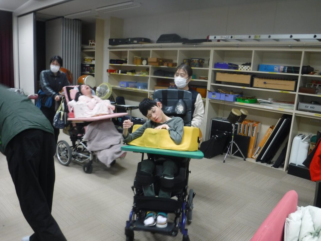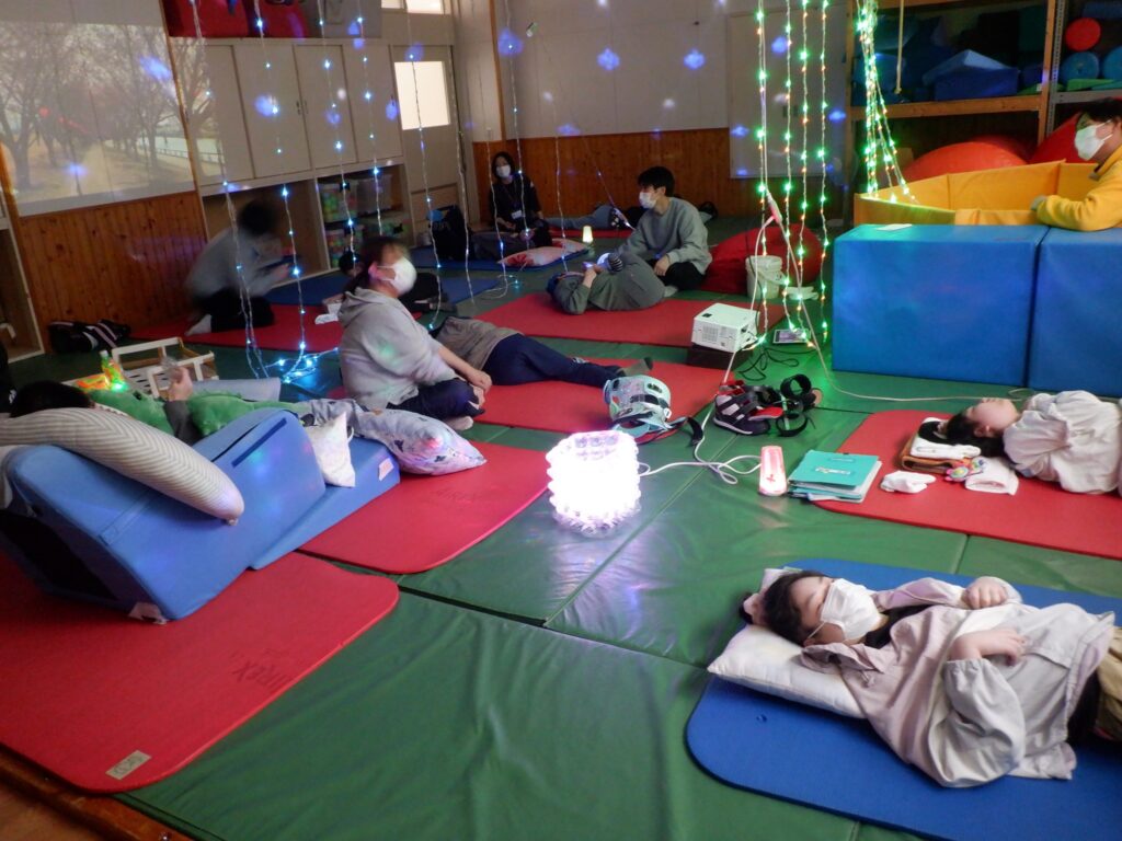 スヌーズレンの時間には、Ⅲ-2Aと2Bと合同になり、自立活動室でスヌーズレンをしました。キラキラ光るライトを見ながら、仲間と一緒に穏やかな時間を過ごすことができました。