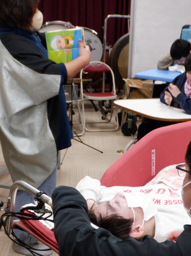 2月25日(水)に『人生音読団』さん(3名)が来校し、高等部Ⅲ-2グループで、絵本の読み聞かせをしてくださいました。いろいろな効果音を鳴らしたり、電子ピアノで音楽を演奏したりしながら、工夫して読んでくださり、みんなリズミカルな言葉や楽しい音をワクワクしながら聞いて、話に引き込まれていきました。
