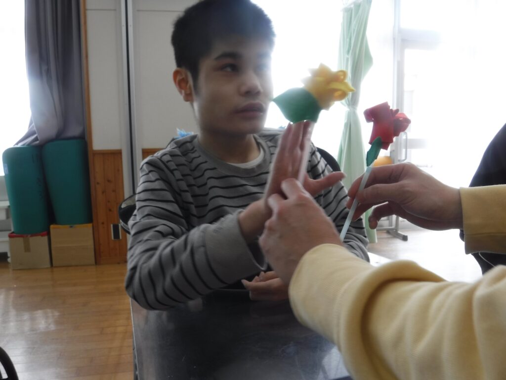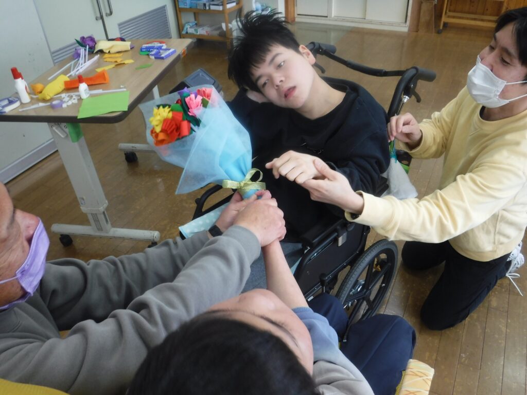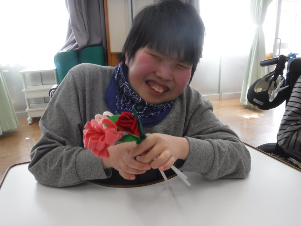 職業、家庭では、フェルトでお花を作って、花束を作る活動をしました。3年生徒の最後の授業では、「ありがとう」という気持ちをこめて、3年生に贈呈しました。