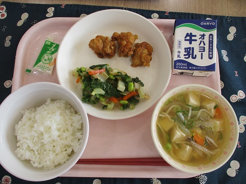 ごはん チキン南蛮 おかかサラダ 豆腐スープ 牛乳
