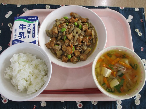 ごはん 厚揚げとれんこんの甘辛煮 すまし汁 牛乳