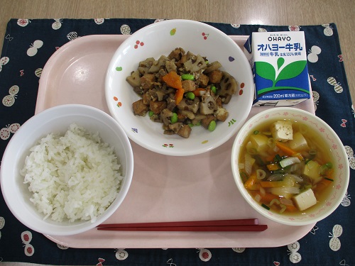 ごはん 豚肉とれんこんの甘辛煮 すまし汁 牛乳